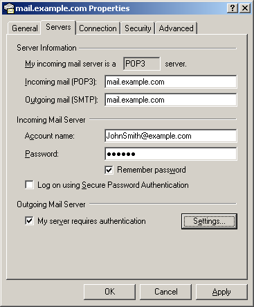 - enter the Mail Server Name for both Incoming Mail and Outgoing Mail;